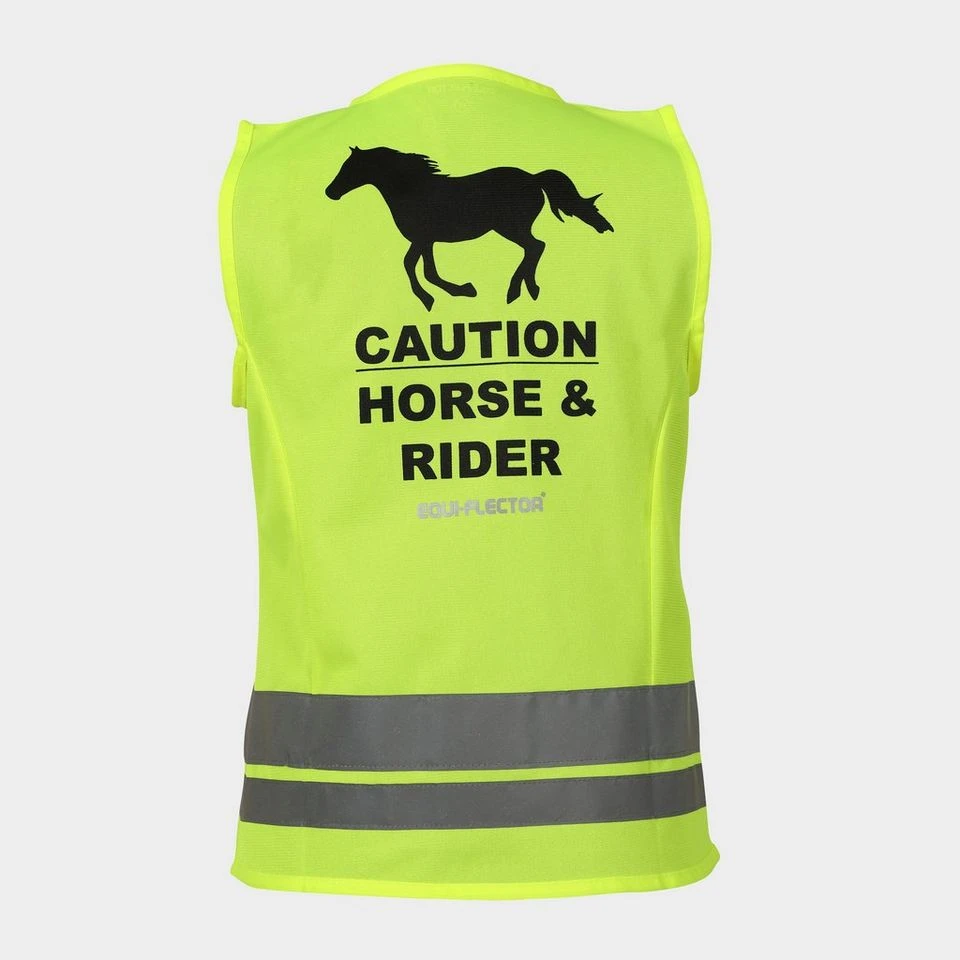 The Shires EQUI-FLECTOR® Safety Vest features one inside pocket, reflective strips, zip fastening and a printed back.