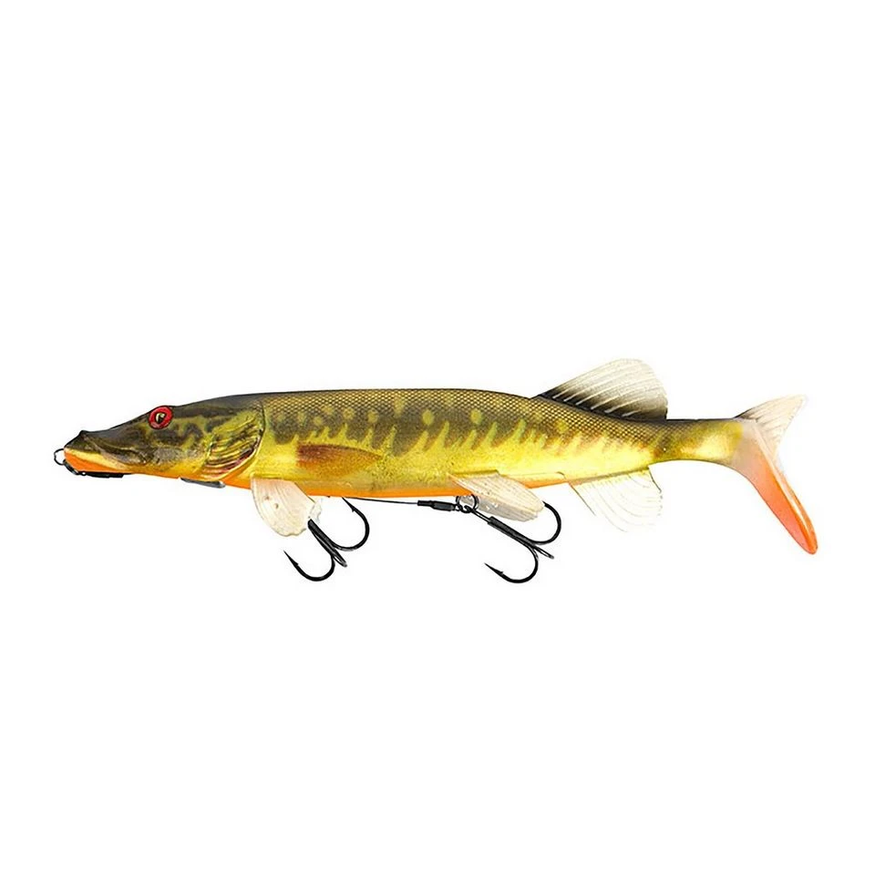 A realistic replicant pike lure, perfect for shallow fishing.